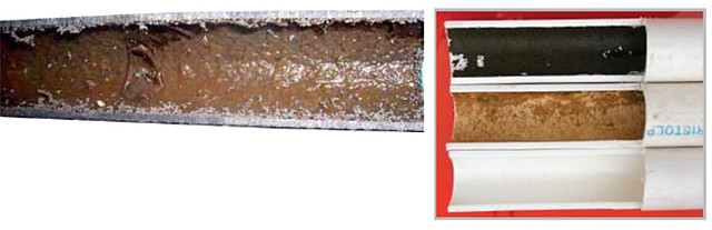 На фотографії показано, як очищається внутрішня стінка труб від біоплівки під дією діоксиду хлору.